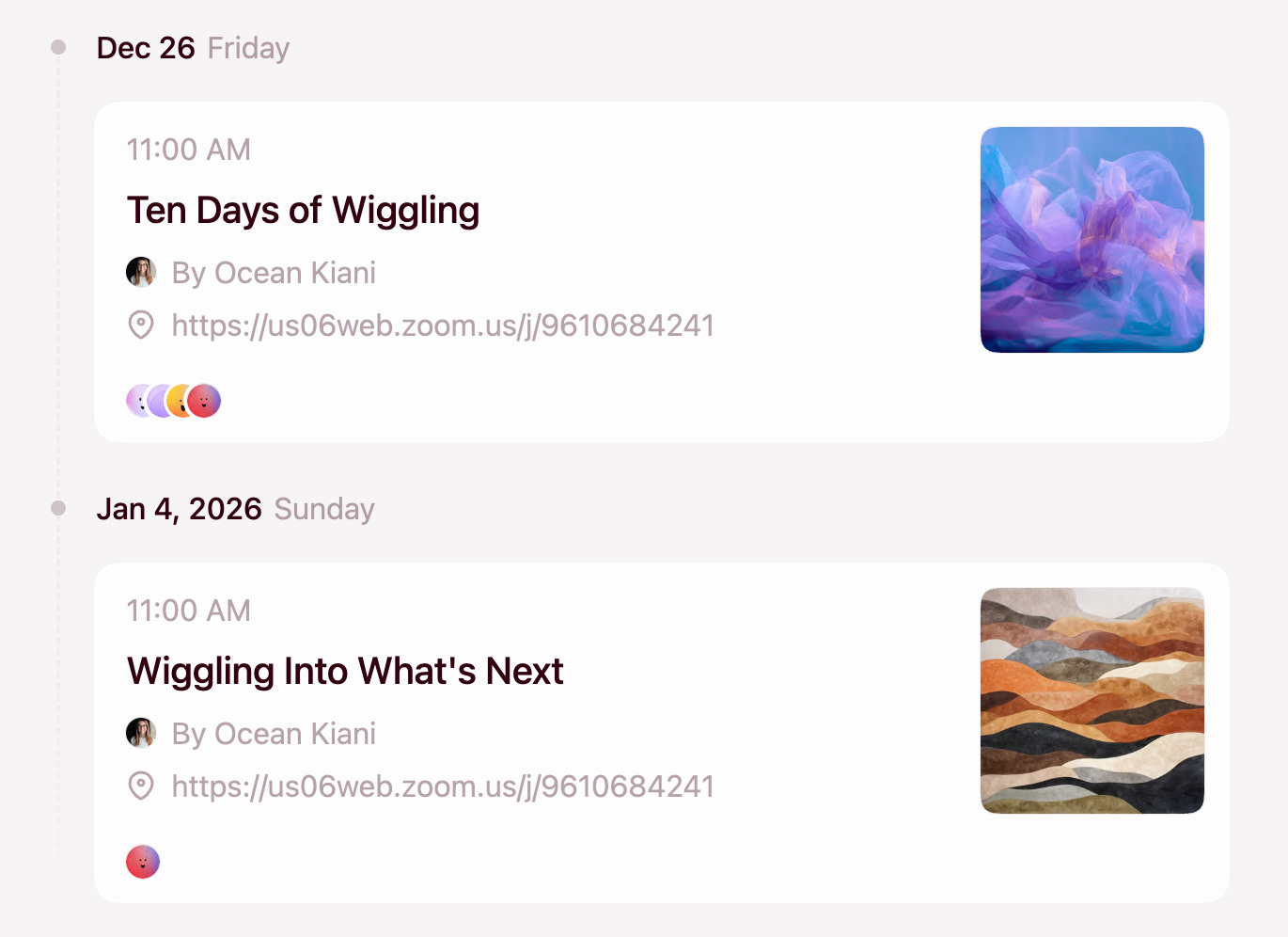 Ten days of wiggling: From Dec 26th to Jan 4th, I’m hosting ten days of wiggling: a daily 30-minute wiggling practice over zoom. My intention for this space is to see what happens when we meet ourselves every day in a mindful movement practice. To round it off, I’m hosting “Wiggling into What’s Next”, a new-year intentions practice rooted in movement. I’d love you to join me (for either or both!).